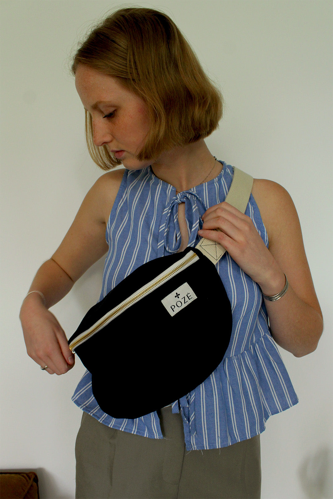 Fabriqué en France, il se distingue aussi par la qualité de ses finitions, avec une doublure en lin/coton de haute qualité, une fermeture éclair en métal doré vieilli, et une tirette en cuir. La sangle réglable, permet un porté confortable adapté à toutes les morphologies adultes. À l’intérieur, une poche plaquée permet de garder l’essentiel à portée de main.